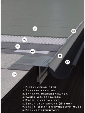 K40 to profil okapowy do wykończenia krawędzi balkonów i tarasów z posadzkami z płytek ceramicznych. Wykonany z aluminium pokrytego powłoką poliestrową, stosowany w systemach izolacji wykonanej z zaprawy uszczelniającej zespolonej z posadzką ceramiczną. Ukształtowanie profilu umożliwia jego szczelne połączenie z izolacją i posadzką ceramiczną. Usytuowane wzdłuż „noska” otwory odprowadzają wilgoć spod posadzki. Konstrukcja profilu dodatkowo umożliwia systemowe mocowanie rynny.